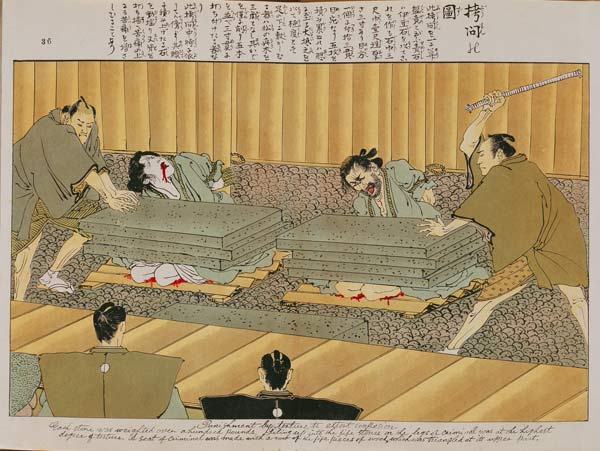 石 (いし, ishi) meaning "stone" or "rock".抱 (だき, daki) meaning "hug" or "embrace". This punishment method involved criminals being bound and having heavy stones placed on top of their legs which sat atop corrugated wood crushing the persons legs/