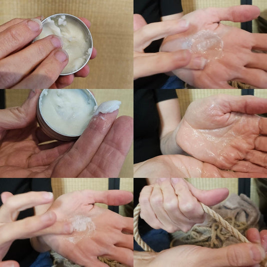 Rope Pastes: I use shea butter mixed with sakura. Application is the same as for oils: add a small amount to your hands, rub it in, and then run your hands along your rope.